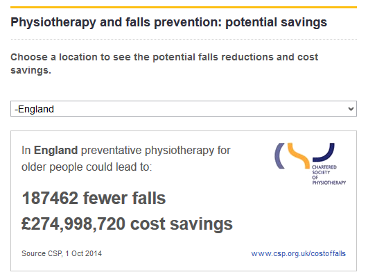 O Βρετανικός Σύλλογος Φυσικοθεραπευτών (C.S.P.) έχει αναπτύξει μια ομάδα διαδυκτιακών εργαλείων, που σας επιτρέπει να υπολογίσετε πόσα χρήματα μπορεί να εξοικονομήσει η Φυσικοθεραπεία από το κόστος των πτώσεων, στον κρατικό προϋπολογισμό.